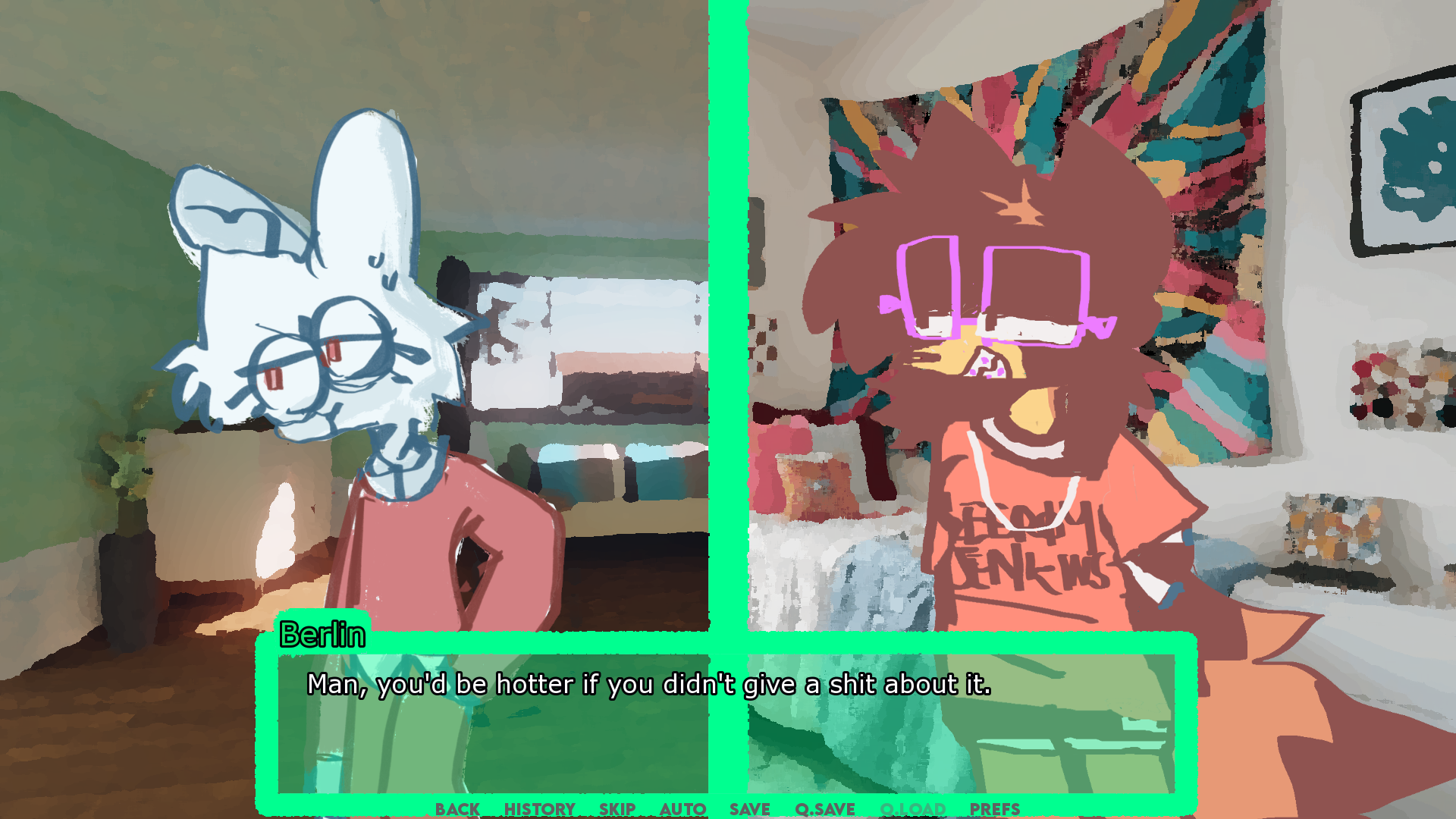 Weird Cities is the sequel to the 2024 furry visual novel Blast Damage Days. A queerplatonic romance story about lesbian love, friendship, and trying to be good to your friends despite being a fuckup.